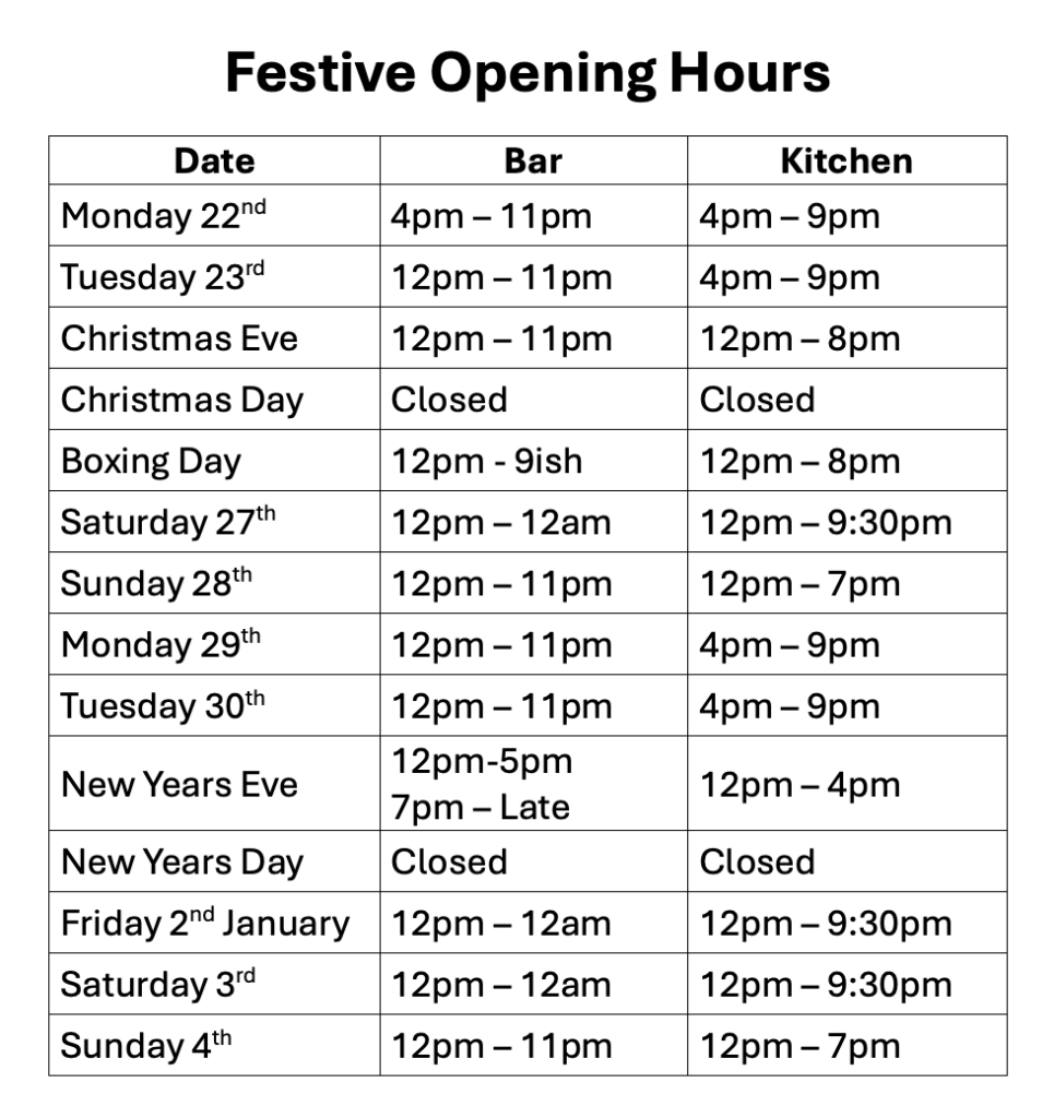 Please note our Festive Opening Hours for the Bar and Kitchen.